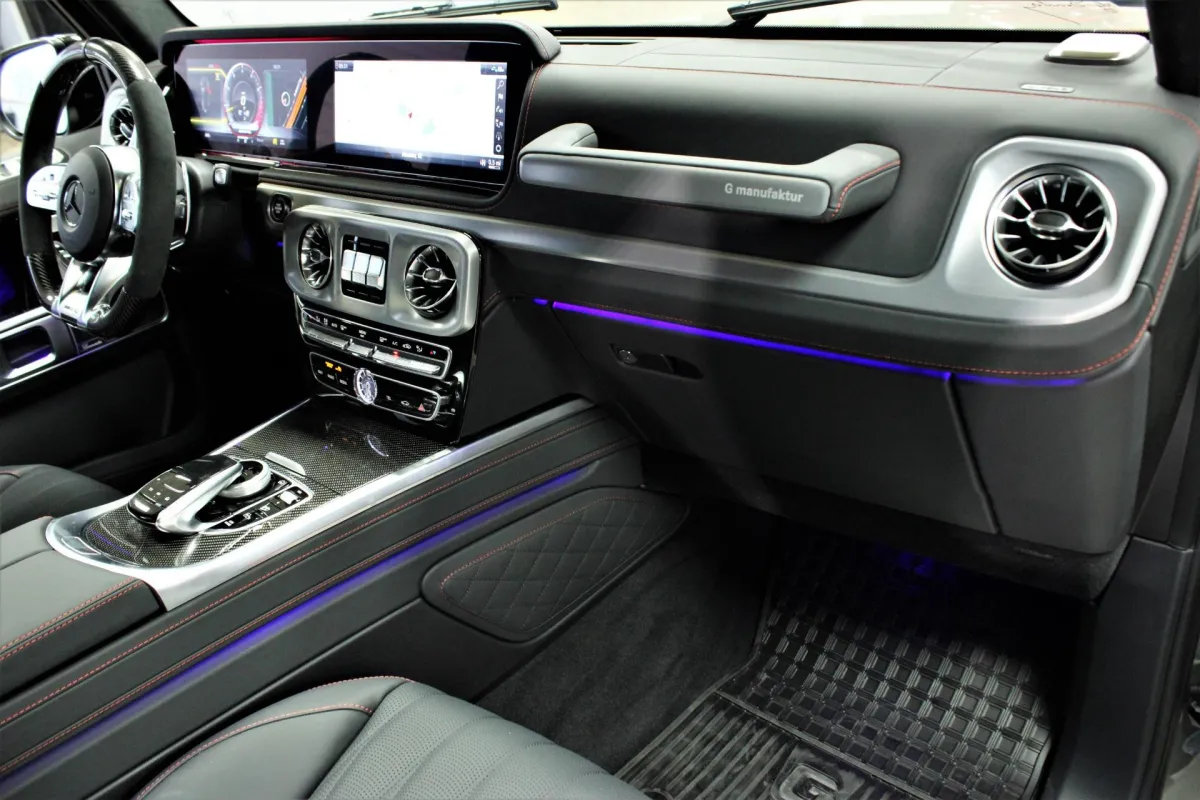 Inside, the G63 surrounds you in pure luxury. Hand-stitched Nappa leather, carbon fiber trim, and customizable ambient lighting elevate every detail. Dual 12.3-inch digital displays fuse cutting-edge technology with elegant design, while the Burmester 3D Surround Sound system turns every drive into a concert experience. Heated, ventilated, and massaging seats ensure unmatched comfort no matter where the road leads.